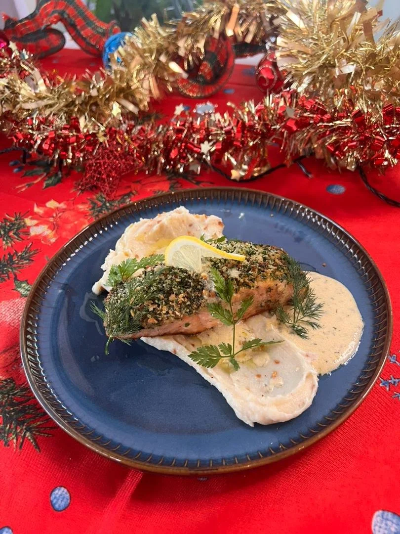 Crispy Herb-crusted oven-baked Salmon fillet with a light lemon-dill creamy sauce.