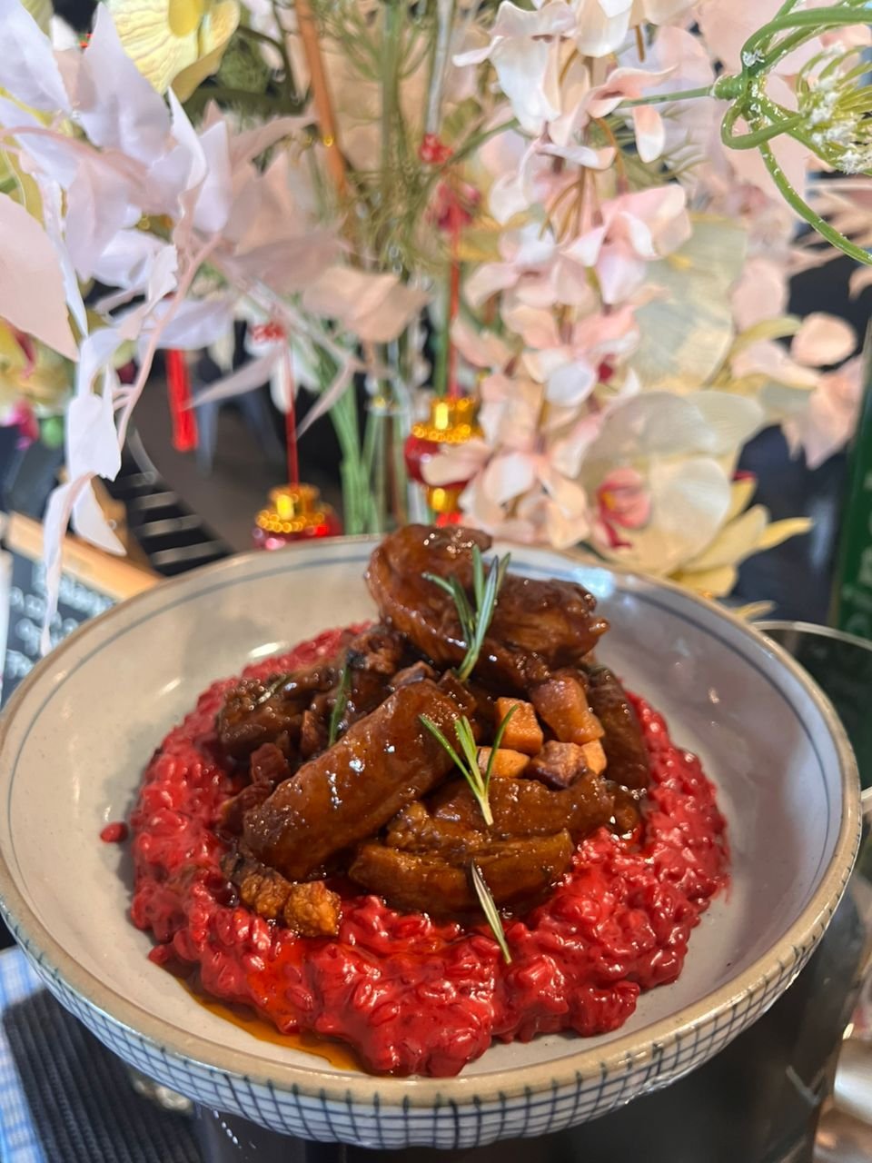 Creamy Red risotto with amazing braised pork ribs and crispy lard bites