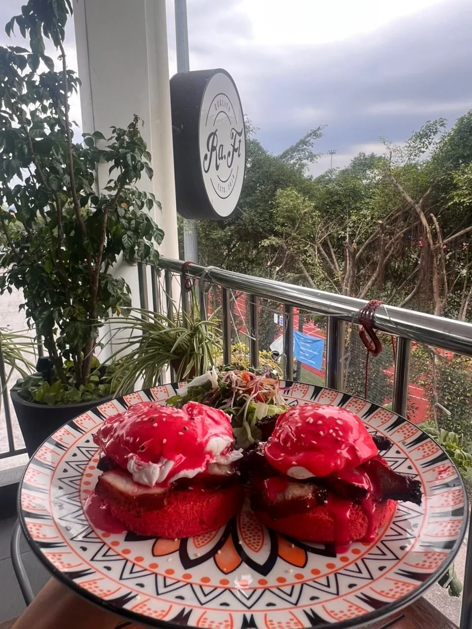 Mouthwatering Eggs Benedict with Home-made Char Siew, red muffin and topped with our special Hollandaise Sauce