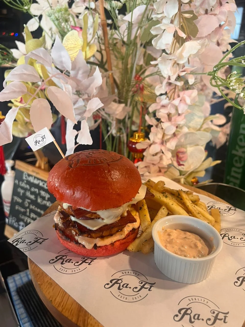 Indulgent Porky Burger with double patty, Bak Kwa slice, fresh red onion rings and special sauce in a Home-Made Red Ra-Ft Brioche Bun