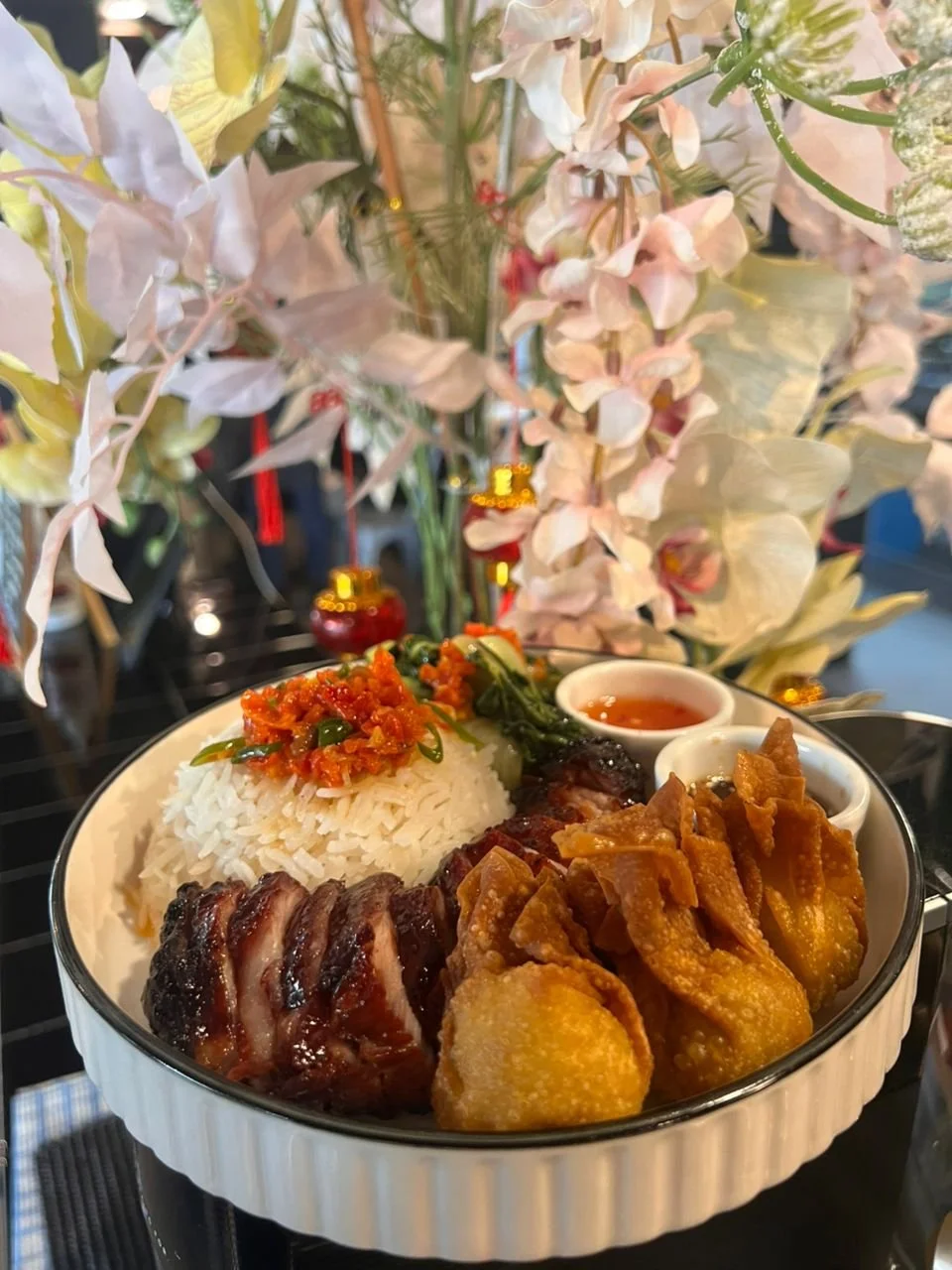 Wonderful home-made Char Siew served with fragrant rice, Pak choy and special Crispy Money Bags