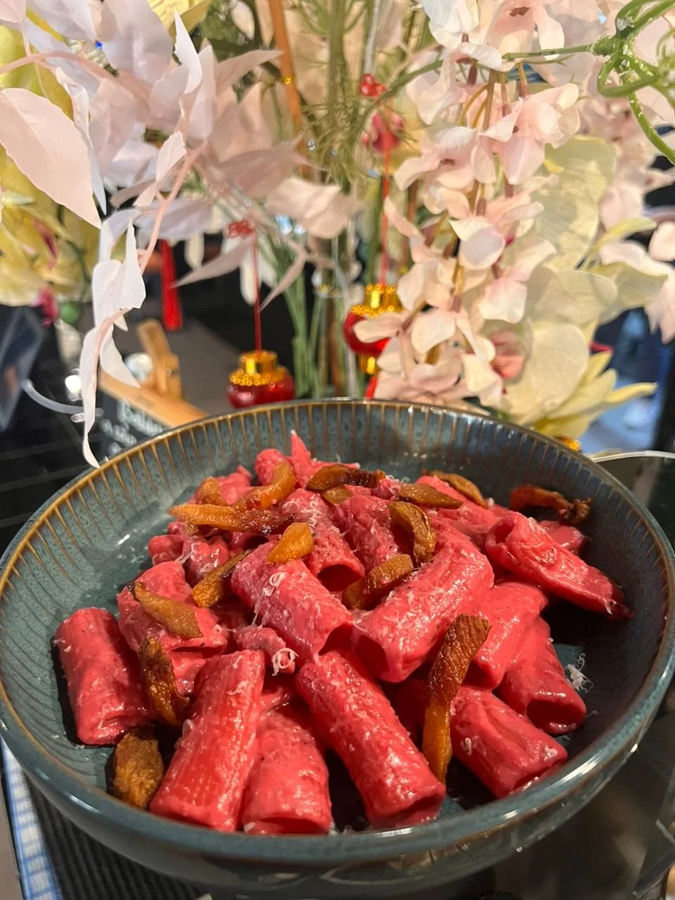 Wonderful beetroot Rigatoni with creamy beetroot sauce and crispy pork cheek