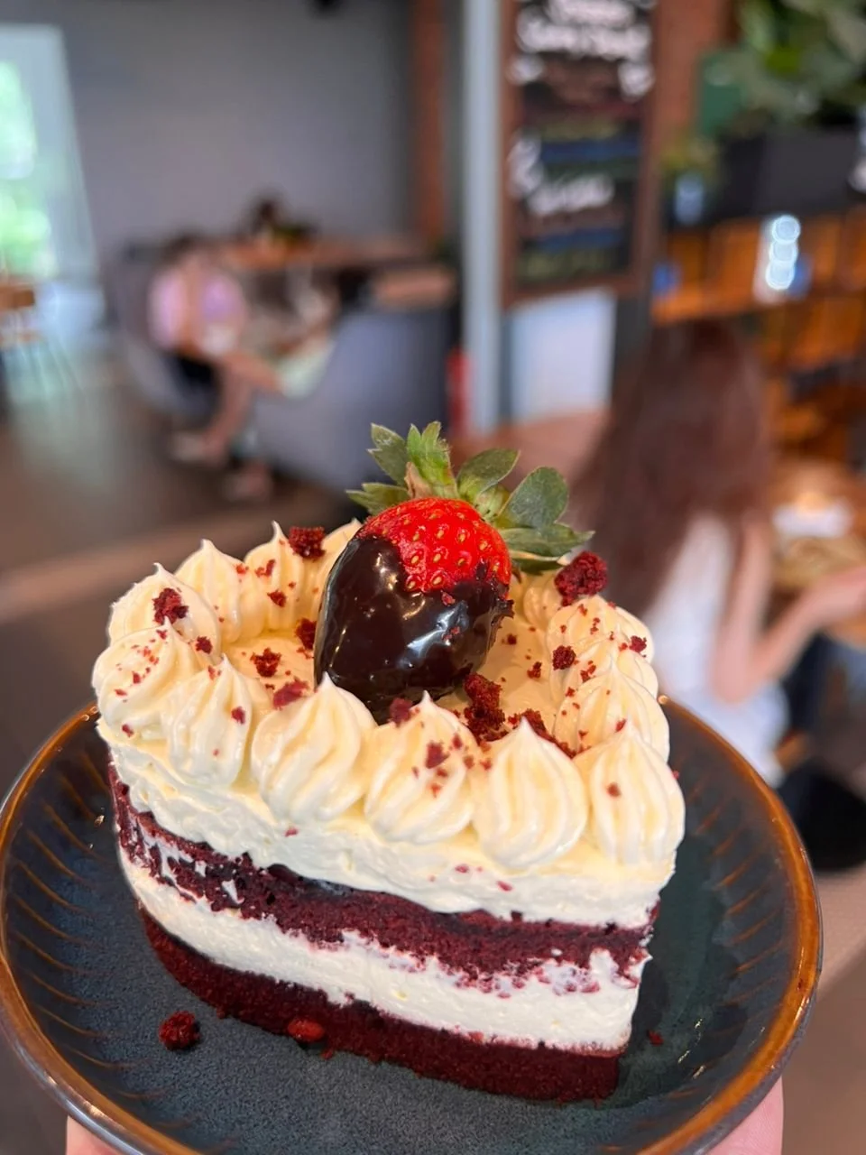 The sweet end of a meal with all the love we put in our home-made Red Velvet heart with chocolate strawberry on top