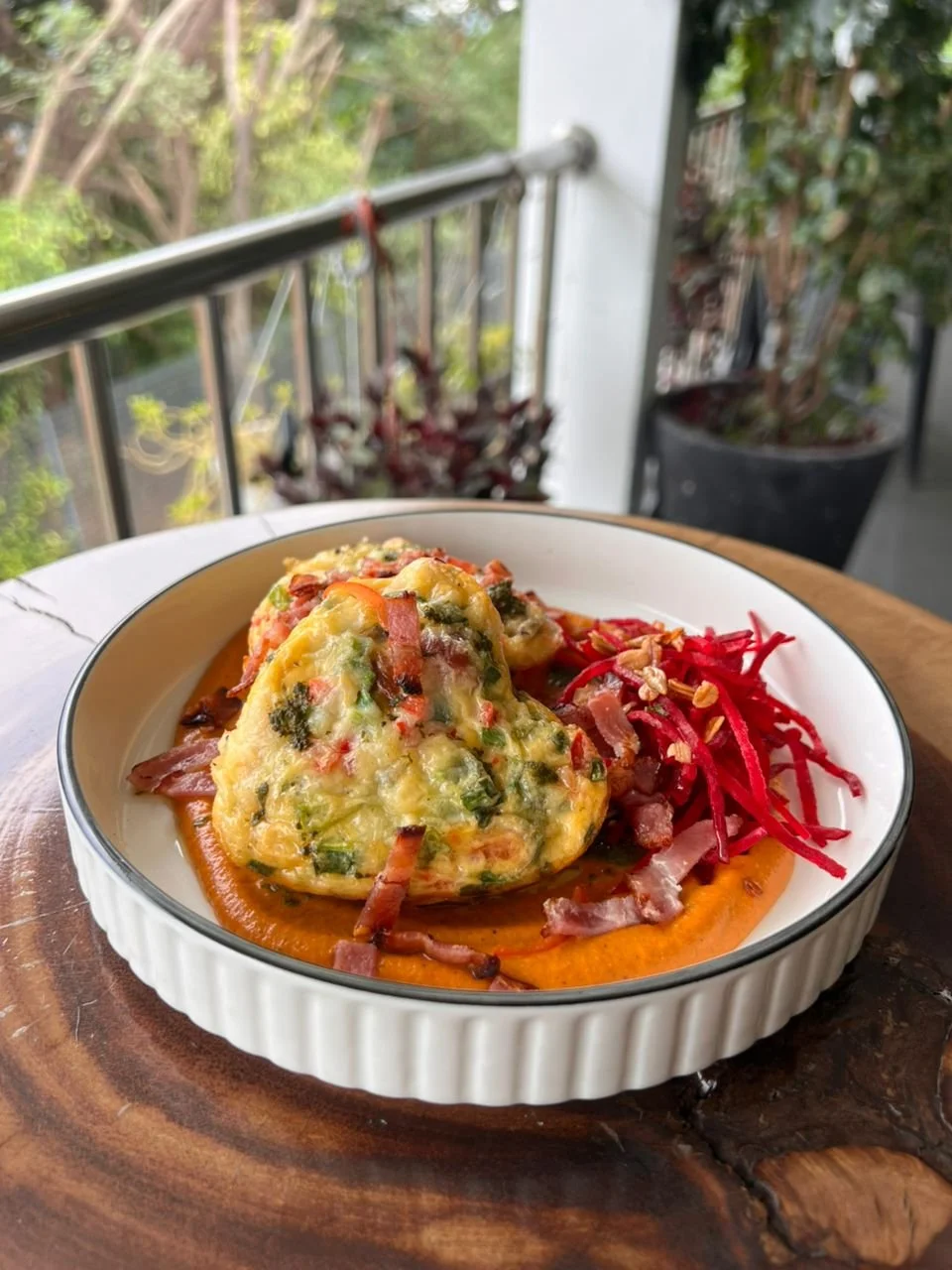 Lovely breakfast/brunch muffins with pork bacon, green and red capsicums, beetroot salad and harissa sauce