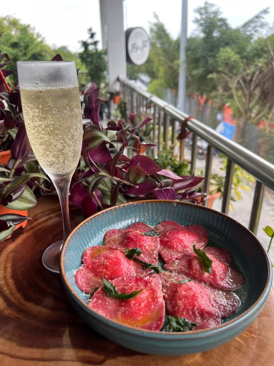 The start of the Valentines Specials, home-made Ravioli with salmon stuffing in a beetroot dough, tossed with butter and sage leaves